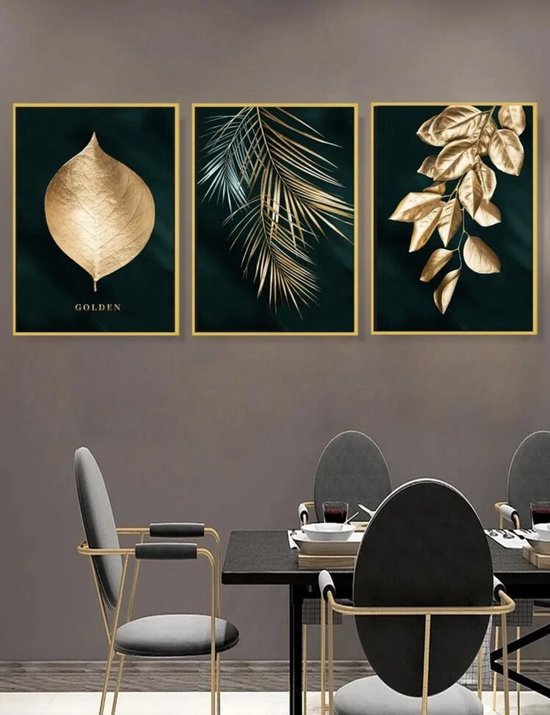 2. Print schilderij - 3 stuks - goud - blad - groen - zwart - golden - decoratie - print - schilderij - hip - gezellige sfeer - huiselijk - 3 posters - poster