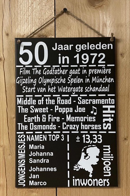 4. Zinken tekstbord 50 jaar geleden in 1972 - Antraciet - 20x30 cm. - verjaardag - jubileum - Sarah - Abraham