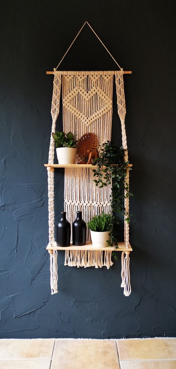 Geef uw huis een vleugje rustieke charme met onze macramé wanddecoratie. Deze hangende plantenhouder met planken is perfect om elke kamer in uw huis op te fleuren. De natuurlijke materialen en aardetinten van de macramé wanddecoratie zorgen voor een rustige en serene sfeer, terwijl de hangende planken een handige plek bieden om kleine snuisterijen of planten in op te bergen. Of je hem nu in je woonkamer, slaapkamer of hal hangt, met deze wanddecoratie maak je zeker een statement.